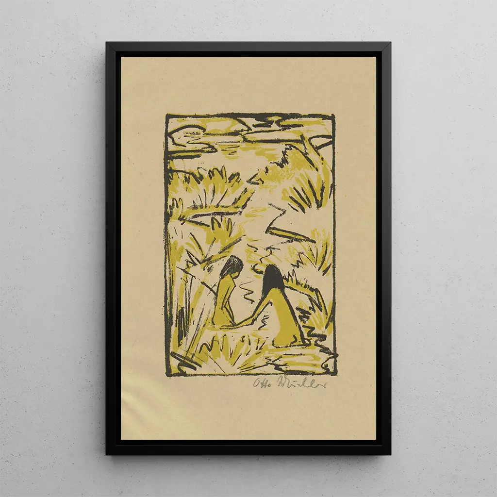 I kunsttrykket af "Deux badende i bækken" dykker Otto Mueller ned i et øjeblik af ro og fællesskab med naturen. Figurerne af badende, gengivet med flydende konturer, synes at smelte sammen med det omkringliggende landskab. De bløde og naturlige farver, der spænder fra beroligende grønne til forfriskende blå, fremkalder en sommerlig og glædesfyldt atmosfære. Dette værk, både intimt og universelt, fejrer skønheden i enkle øjeblikke, hvor mennesket og naturen eksisterer i harmoni.