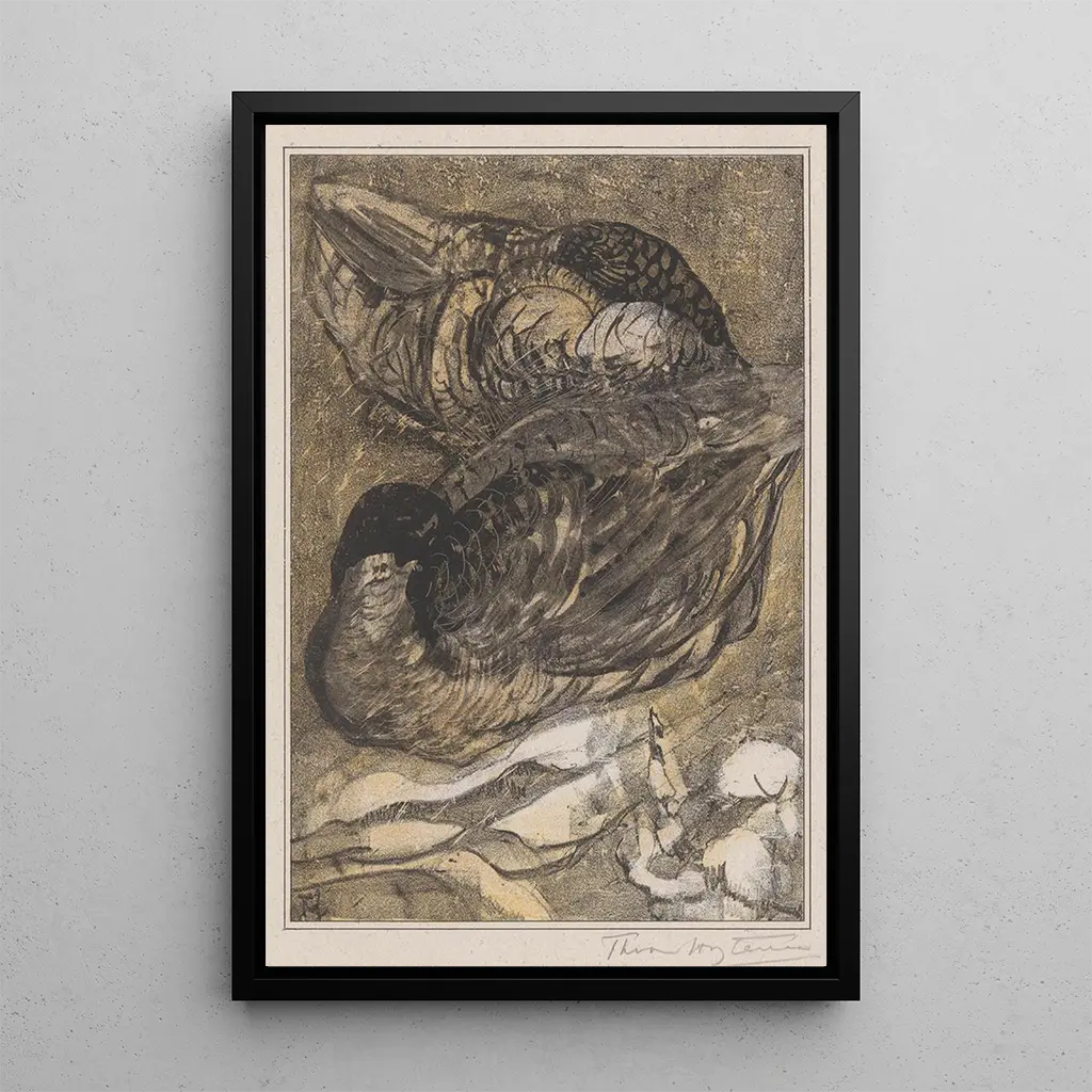 I dette delikate værk fanger Theo van Hoytema essensen af fred med sine to sovende ænder. Kompositionen er harmonisk, hvor de bløde nuancer af grøn og blå smelter sammen for at fremkalde en følelse af fred. Akvarelteknikken, med sine flydende nuancer, giver liv til scenen, samtidig med at den bevarer en drømmende atmosfære. Ænderne, fredeligt placeret på vandet, synes at svæve i en anden verden, hvilket inviterer betragteren til at standse op og betragte dette flygtige øjeblik af naturen.