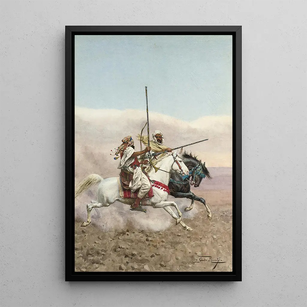 "Deux cavaliers arabes" af Giulio Rosati er et værk, der fremhæver styrke og majestæt af heste, symboler på frihed og mod. I denne komposition ser rytterne, klædt i traditionelle kostumer, ud til at galoppere yndefuldt gennem et ørkenlandskab, hvor nuancer af sand og himmel smelter harmonisk sammen. Rosatis teknik, der kombinerer realisme og dynamik, fanger bevægelsen af hestene og intensiteten i rytternes blikke, hvilket skaber en atmosfære, der er både episk og poetisk. Dette lærred inviterer til drømme om fjerne eventyr og eksotiske landskaber.