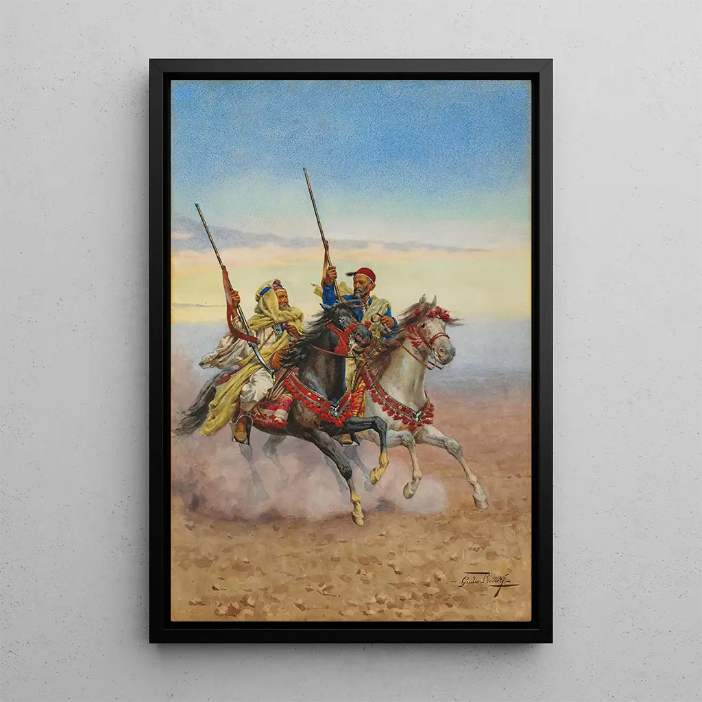 Giulio Rosati, italiensk maler fra det 19. århundrede, er anerkendt for sit talent til at fange scener fra den orientalske livsstil med enestående præcision og følsomhed. Påvirket af sine rejser i Nordafrika og Mellemøsten, formåede Rosati at integrere elementer fra disse kulturer i sine værker, hvilket gør ham til en ikonisk figur inden for orientalismens bevægelse. Hans stil, præget af en omhyggelig opmærksomhed på detaljer og en dygtig brug af lyset, har gjort ham i stand til at skille sig ud blandt sine samtidige. "Deux cavaliers" vidner om hans evne til ikke kun at portrættere personer, men også sjælen i den kultur, han skildrer, hvilket gør hvert maleri til et vindue til en fascinerende verden.