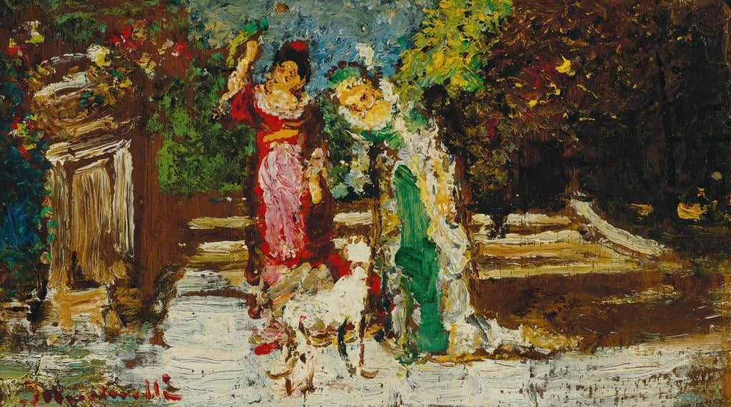 Kunsttrykket af Deux femmes et chien af Adolphe Monticelli transporterer os til et øjeblik af ømhed og samhørighed. De livlige farver og de dynamiske penselstrøg skaber en levende atmosfære, hvor figurerne synes at blive levende foran vores øjne. Lærredet udstråler en mærkbar varme takket være den dygtige anvendelse af varme nuancer, der omslutter figurerne. Monticelli, med sin unikke stil, formår at fange essensen af hverdagslivet, samtidig med at han tilføjer et strejf af poesi og drøm.