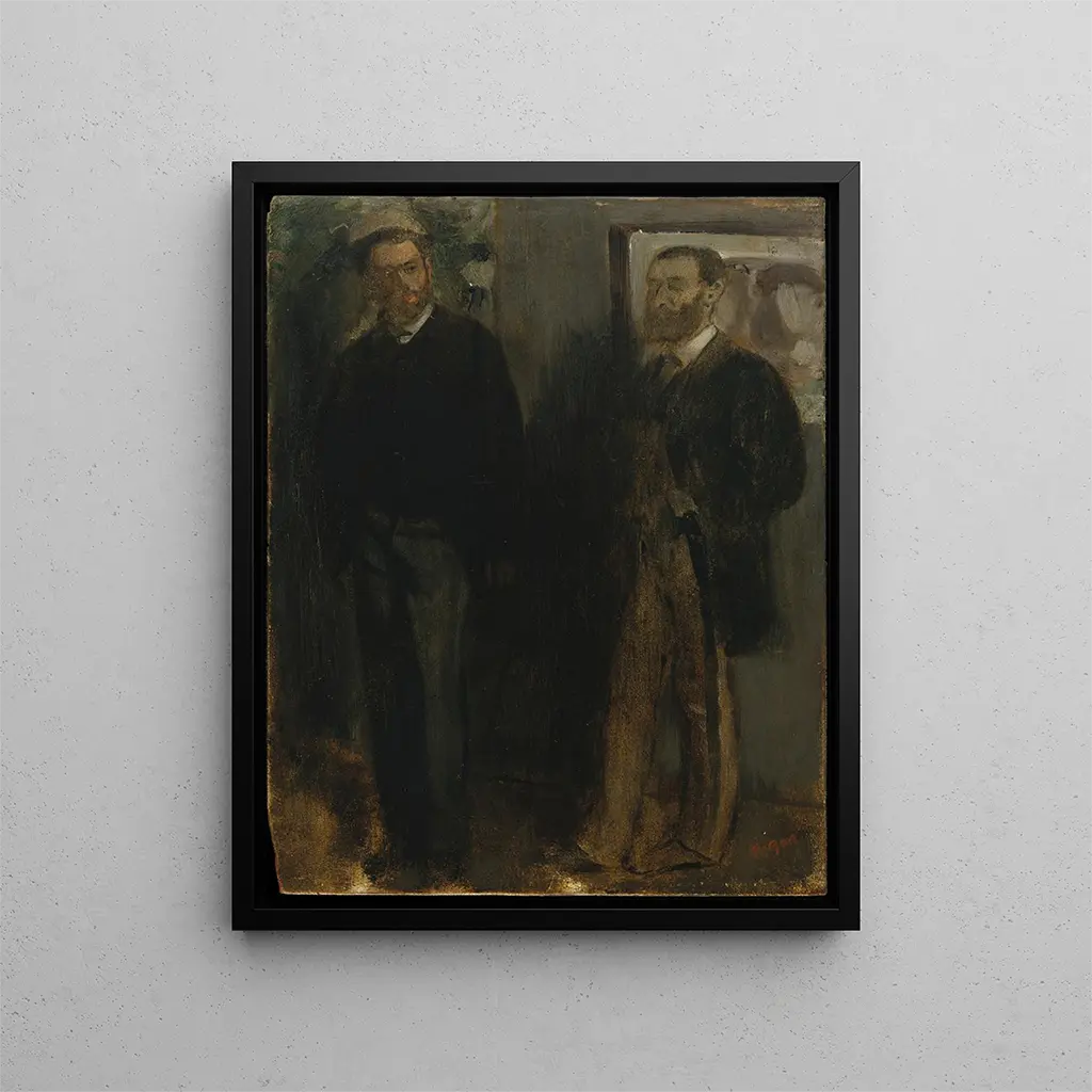 Edgar Degas' stil er utvivlsomt præget af en impressionistisk tilgang, samtidig med at den adskiller sig gennem en unik teknik og en skarp sans for komposition. I "L L" leger Degas med lys og former, og bruger dynamiske penselstrøg, der giver liv til figurerne. Mandernes holdning, deres gestik og ansigtsudtryk er alle elementer, der afslører kunstnerens mestring i at fange menneskelige følelser. Dette kunsttryk er også kendetegnet ved en omhyggeligt udvalgt farvepalette, hvor varme og kolde nuancer flettes sammen for at skabe en intim atmosfære. Værket nøjes ikke med at skildre en scene, det fortæller en historie – om et møde, en udveksling, en stille samhørighed, der resonnerer med betragteren.