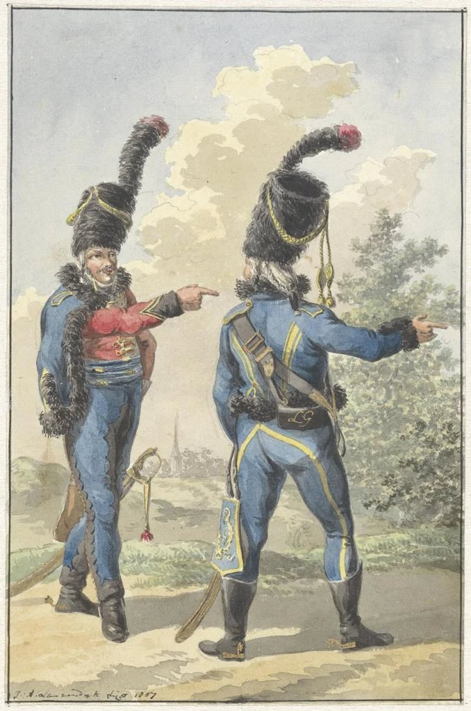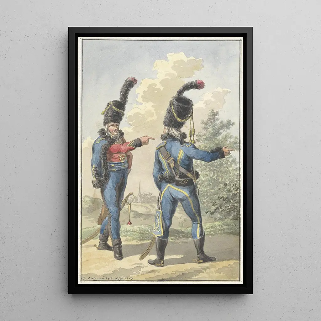 I kunsttrykket "To militære stående" præsenterer Jan Anthonie Langendijk en fængslende scene, hvor to militære figurer står stolt. Den rette og selvsikre positur hos personerne antyder en vis autoritet og pligtfølelse. De omhyggelige detaljer i uniformerne, samt nuancerne i farverne, skaber en atmosfære af respekt og alvor. Lyset spiller en afgørende rolle, fremhæver ansigtstræk og teksturer i tøjet. Dette værk inviterer betragteren til at betragte ikke kun militærernes udseende, men også den historiske kontekst, der omgiver dem.
