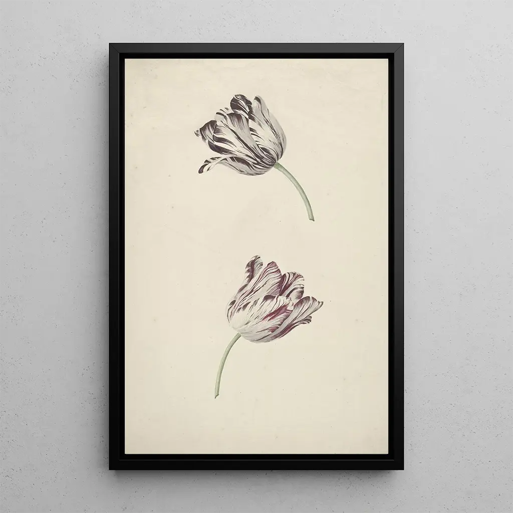 I denne kunsttryk af værket "To tulipaner røde og hvide" fanger kunstneren Jan Laurensz van der Vinne delikatesse og pragt af blomsterne. De livlige farver på tulipanerne, røde og hvide, flettes sammen med bemærkelsesværdig finesse, hvilket skaber en slående kontrast. Teknikken med oliemaling gør det muligt at gengive teksturen af blomsterbladene næsten håndgribeligt, mens lyset leger over konturerne og tilføjer en næsten levende dimension til kompositionen. Atmosfæren, der udspringer af dette lærred, fremkalder en fredelig eftertanke og inviterer betragteren til at værdsætte naturens flygtige skønhed.
