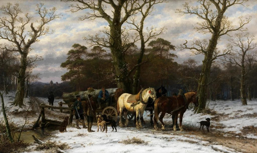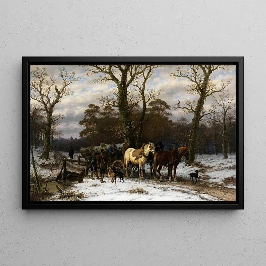 I "Les Marchands de bois" skildrer Caesar Bimmermanns værk en vibrerende atmosfære gennem varme farver og omhyggelige detaljer. Maleriet forestiller en markedsplads, hvor mænd travlt beskæftiger sig med træstammer, hvilket illustrerer skovhandlens vitalitet. Jordnære nuancer og lyslege skaber en både realistisk og poetisk stemning, der inviterer betragteren til at dykke ned i denne arbejdsverden. Bimmermanns teknik, der dygtigt kombinerer realisme med et strejf af impressionisme, giver liv til hver enkelt figur, hvilket gør helheden fængslende og dynamisk.