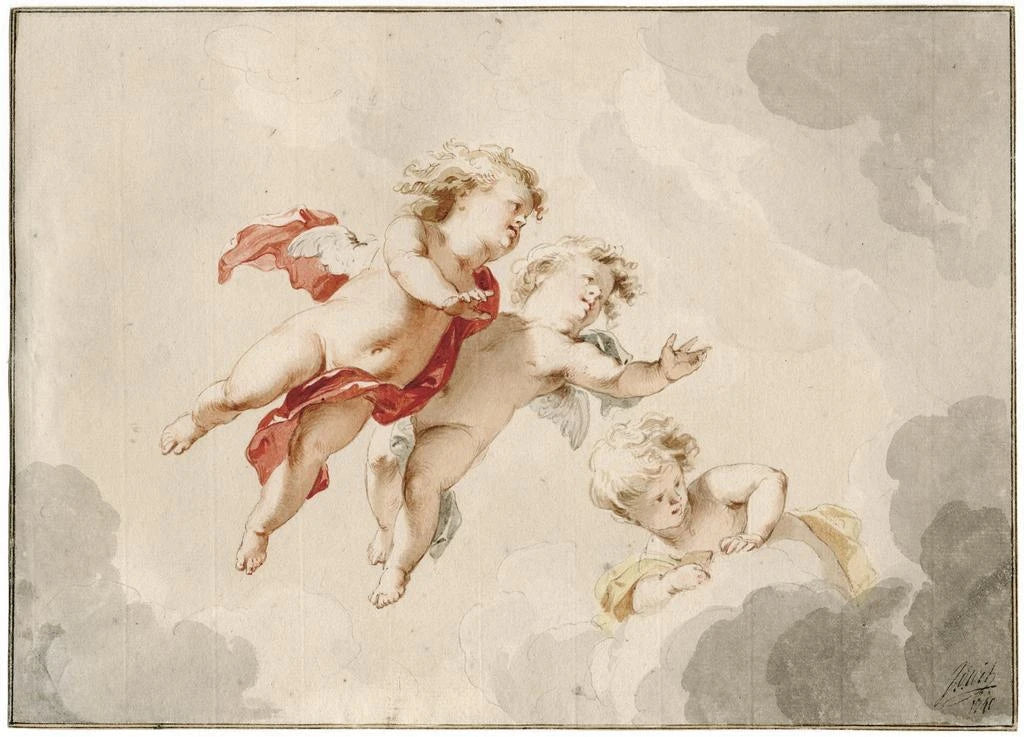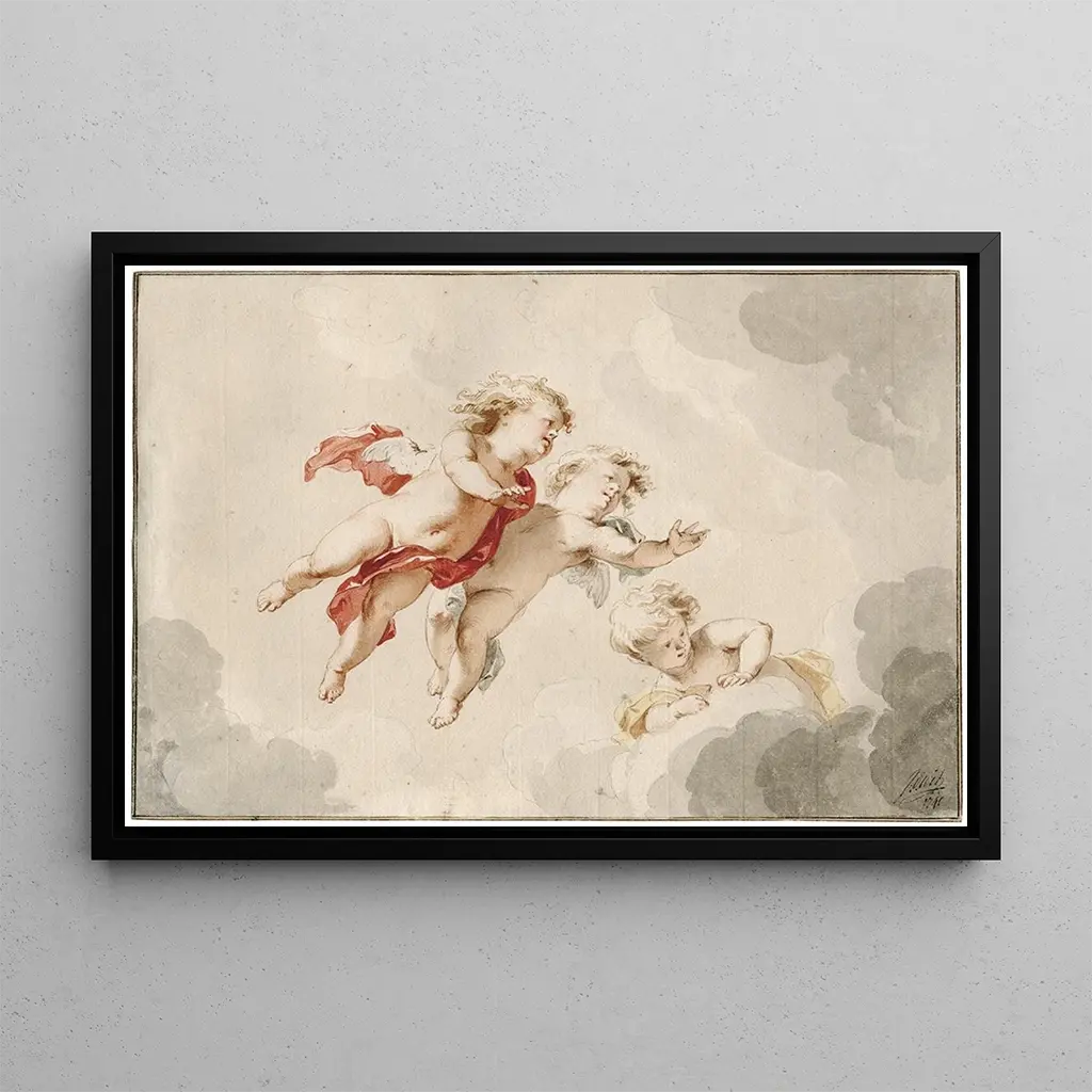 Tre flyvende putti: en himmelsk danses fuld af lethed I dette fængslende værk tager Jacob de Wit os med ind i et luftigt univers, hvor tre putti, disse charmerende små engle, synes at svæve yndefuldt. Kompositionen er et sandt ballet af pastelfarver, hvor de bløde nuancer af rosa, blå og creme smelter harmonisk sammen. Teknikken med oljemaling gør det muligt at gengive ansigtets delikatesse og klædedragten, hvilket skaber en atmosfære, der både er glædesfyldt og drømmende. Hvert eneste detalje, fra putti'ernes udtryk til skyggernes nuancer, bidrager til indtrykket af en scene, der hænger i luften, og inviterer betragteren til at forundres over denne guddommelige lethed. Jacob de Wit: en mester i hollandsk rokoko Jacob de Wit, aktiv i det 18. århundrede, er anerkendt som en af de førende repræsentanter for rokoko-stilen i Nederlandene. Påvirket af tidens store mestre, har han formået at udvikle et unikt kunstnerisk sprog, der kombinerer finesse og overdådighed. Hans karriere, præget af adskillige bestillinger til paladser og kirker, vidner om hans betydning i det europæiske kunstlandskab. Hans værker, ofte fyldt med mytologiske figurer og allegoriske scener, afspejler en tid, hvor kunsten skulle være både dekorativ og narrativ, og fange den kollektive fantasi i sin samtid. En dekorativ kunsttryk med mange fordele Reproduktionen af "Tre flyvende putti" er et ideelt dekorativt valg til forskellige rum såsom stuen, kontoret eller soveværelset. Den bløde palette og de fortryllende motiver tilføjer et strejf af ro og elegance til ethvert interiør. Kvaliteten af kunsttrykket sikrer en bemærkelsesværdig trofasthed til det originale værk, hvilket gør det muligt at nyde dets æstetiske appel uden kompromis. Ved at integrere dette kunsttryk i din indretning giver du dit rum en raffineret kunstnerisk note, samtidig med at du vækker beundring hos dine gæster.