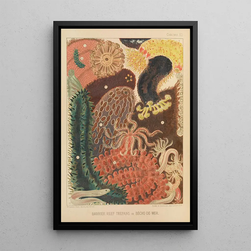 Kunsttrykket Trepang af koralrevet tager os med på en fascinerende undervandsrejse. William Saville-Kent, en mester i farver, bruger en livlig palet til at fange skønheden i det marine bundland. Nuancer af blå og grøn blandes harmonisk, hvilket fremkalder klarheden i tropiske farvande. Akvarelteknikken, med sine delikate lag, giver mulighed for at gengive gennemsigtigheden og den flydende karakter af det marine miljø. Atmosfæren, der udspringer af dette lærred, er både beroligende og mystisk, hvilket inviterer seeren til at udforske havets skjulte rigdomme.