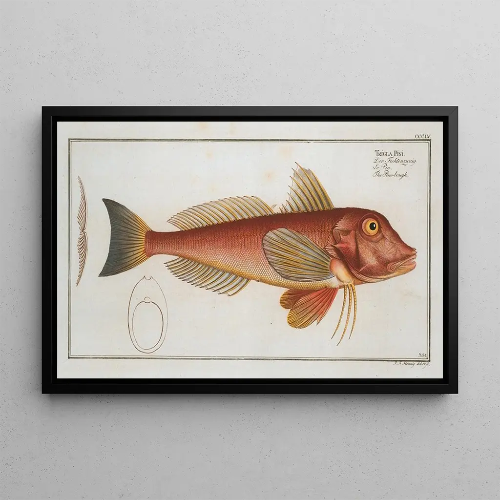 Kunsttrykket af Trigla pini La branche de pin fremkalder en beroligende ro, hvor detaljernes finhed kombineres med farvernes rigdom. Værket viser en fint gengivet gren af en pin, hvor hver nål og hvert kongle er omhyggeligt afbildet. Akvarelteknikken, med sine subtile nuancer, skaber en næsten drømmende atmosfære, der inviterer betragteren til at dykke ned i naturens skønhed. Lyset spiller en afgørende rolle, idet det oplyser de dybe grønne nuancer og de varme brune toner, mens den slørede baggrund fremhæver grenens skarphed og skaber en slående kontrast.