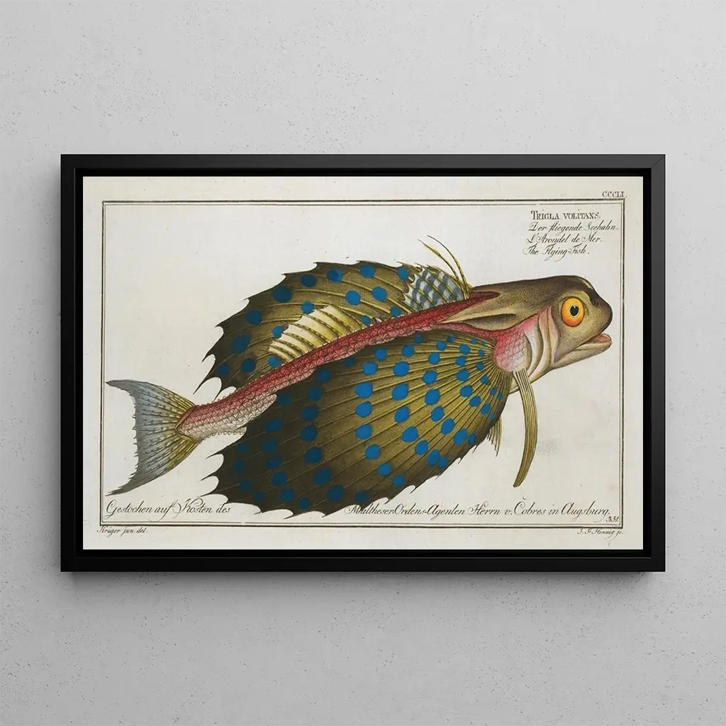 Trigla volitans, den flyvende fisk: en vidunderlighed fra de dybe hav Kunsttrykket "Trigla volitans, den flyvende fisk" af Marcus Elieser Bloch er en fascinerende repræsentation af det marine biodiversitet. Dette maleri, rigt på detaljer, fremhæver de skinnende farver og de delikate teksturer af denne ikoniske fisk. Bloch, med sin videnskabelige og kunstneriske tilgang, formår at fange ikke kun dyrets udseende, men også dets essens. Nuancerne af blå og grøn, kombineret med røde indslag, skaber en levende og dynamisk atmosfære, der inviterer betragteren til at dykke ned i det akvatiske univers. Hvert penselstrøg vidner om en grundig observation, der hylder naturens skønhed. Marcus Elieser Bloch: en pioner inden for zoologisk illustration Marcus Elieser Bloch, naturforsker og illustratør fra det 18. århundrede, er anerkendt for sine bidrag til zoologisk kunst. Hans værk, "Ichthyologie", revolutionerede måden, hvorpå fisk blev fremstillet, ved at kombinere videnskabelig præcision med æstetik. Bloch rejste gennem Europa og længere væk, inspireret af sine møder med det marine dyreliv, for at skabe værker, der er både informative og kunstneriske. "Trigla volitans" er et perfekt eksempel på hans talent, der illustrerer ikke kun skønheden af fisken, men også vigtigheden af at bevare marine arter i en tid, hvor naturen stadig var stort set uudforsket. En dekorativ kunsttryk med mange fordele Kunsttrykket af "Trigla volitans, den flyvende fisk" er et dekorativt stykke, der vil fange opmærksomheden i ethvert rum. Uanset om det er i et kontor, et legerum eller endda et køkken, tilføjer dette maleri et maritimt og levende præg til din indretning. Dets trykkvalitet sikrer en enestående trofasthed til detaljerne i det originale værk, hvilket gør det muligt at værdsætte hver nuance og tekstur. Ved at vælge dette kunsttryk giver du dit hjem en note af elegance og nysgerrighed, samtidig med at du fejrer skønheden i det akvatiske liv.