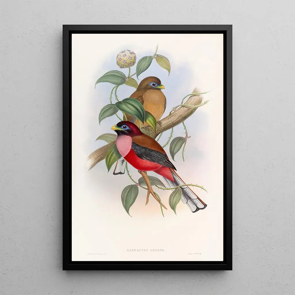 John Gould, aktiv i det 19. århundrede, er anerkendt som en pioner inden for ornitologisk illustration. Hans passion for fugle førte ham til at rejse verden rundt, indsamle eksemplarer og informationer til sine værker. Påvirket af tidens videnskabelige opdagelser formåede han at kombinere præcision og æstetik i sine illustrationer. Trogon med lyserødt bryst er et af hans mesterværker, hvilket vidner om hans engagement i at repræsentere naturens skønhed, samtidig med at han bidrager til ornitologisk videnskab. Hans arv består, og inspirerer kunst- og naturentusiaster.