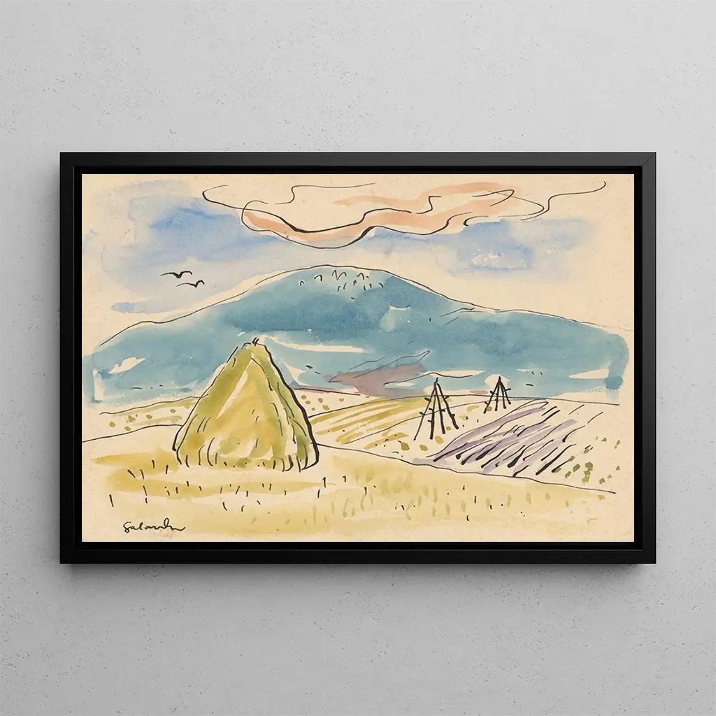Løget "Turiec" af Mikuláš Galanda fremkalder et betagende landskab, hvor naturen synes at blomstre i en perfekt harmoni. De bløde og pastelagtige farver, der blander nuancer af grøn, blå og gul, skaber en beroligende, næsten drømmende atmosfære. Kunstnerens teknik, der kombinerer realisme med en impressionistisk touch, gør det muligt at føle lyset filtrere gennem bladene, mens bjergenes former skitseres med finesse. Dette kunsttryk inviterer til meditativ eftertanke, hvor hvert blik afslører nye subtiliteter.