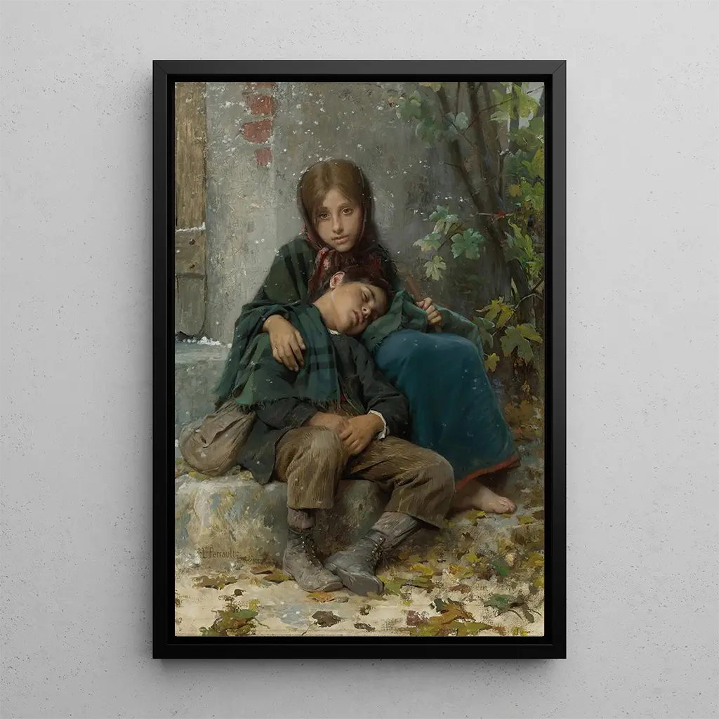 En kunsttryk af værket "Dehors dans le froid" af Léon Jean-Basile Perrault fremkalder en vinterscene, hvor naturen afslører sin barske skønhed. De kolde farver dominerer lærredet, med nuancer af blå og grå, der forstærker indtrykket af kulde og ensomhed. Perraults teknik, præget af ekspressive penselstrøg, skaber en atmosfære, der er både melankolsk og kontemplativ. Personerne, isolerede i dette iskolde landskab, synes i harmoni med omgivelserne og inviterer betragteren til at føle den barske vinterskønhed.