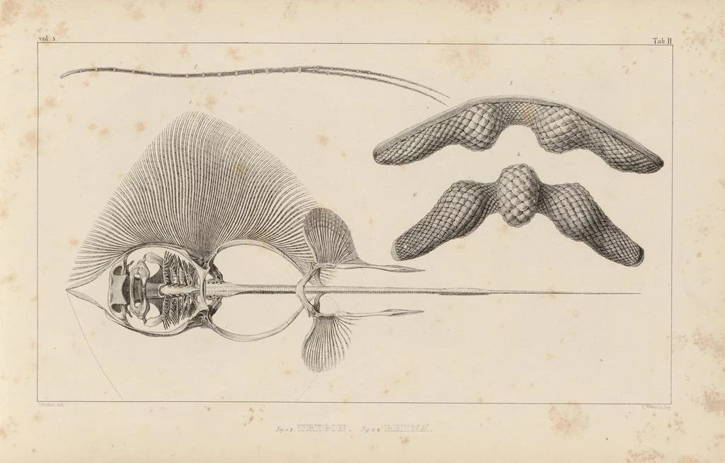 Louis Agassiz, naturforsker og geolog fra det XIX. århundrede, spillede en grundlæggende rolle i udviklingen af moderne palæontologi. Oprindeligt fra Schweiz, blev han påvirket af tidens fremskridt, især evolutionsteorierne. Hans passion for studiet af fossiler førte til værker, der kombinerer videnskabelig stringens med æstetik. Agassiz bidrog ikke kun til klassificeringen af arter, men populariserede også palæontologi gennem sine illustrationer. "Recherches sur les poissons fossiles Pl260" er et emblemisk eksempel på hans tilgang, hvor hver detalje er omhyggeligt observeret og gengivet.