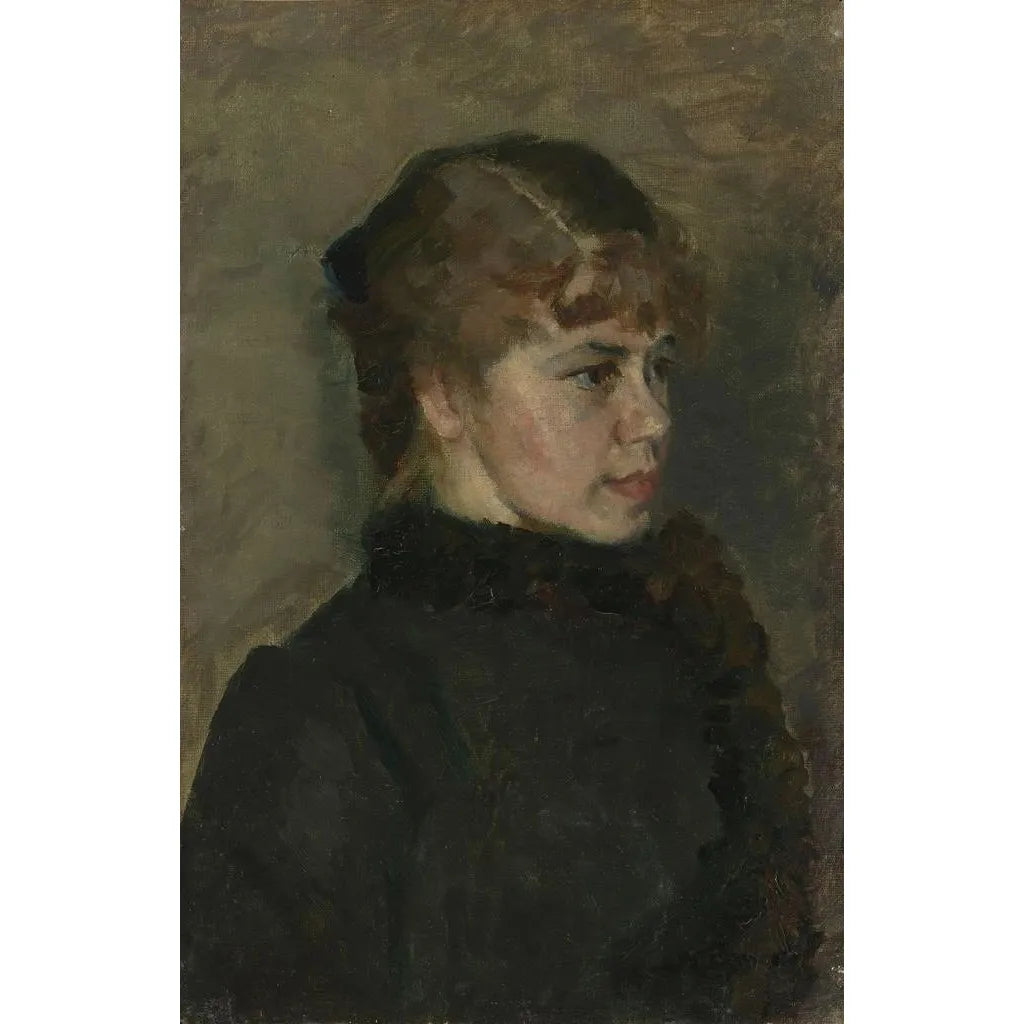 I dette fængslende værk præsenterer Christian Krohg en ung kvinde med et tænksomt blik, indhyllet i blødt og varmt lys. Kompositionen, både enkel og suggestiv, fremhæver de fine træk i hendes ansigt og den flydende bevægelse af hendes hår. Pastelfarver, der blander nuancer af rosa og blå, skaber en intim, næsten drømmende atmosfære. Olie-maleteknikken, udført med finesse, tilføjer en rig tekstur, der fanger øjet og inviterer til eftertanke. Dette maleri, en ægte afspejling af kunstnerens følsomhed, fører os ind i et øjeblik af delikatesse og poesi.