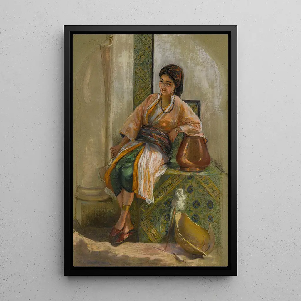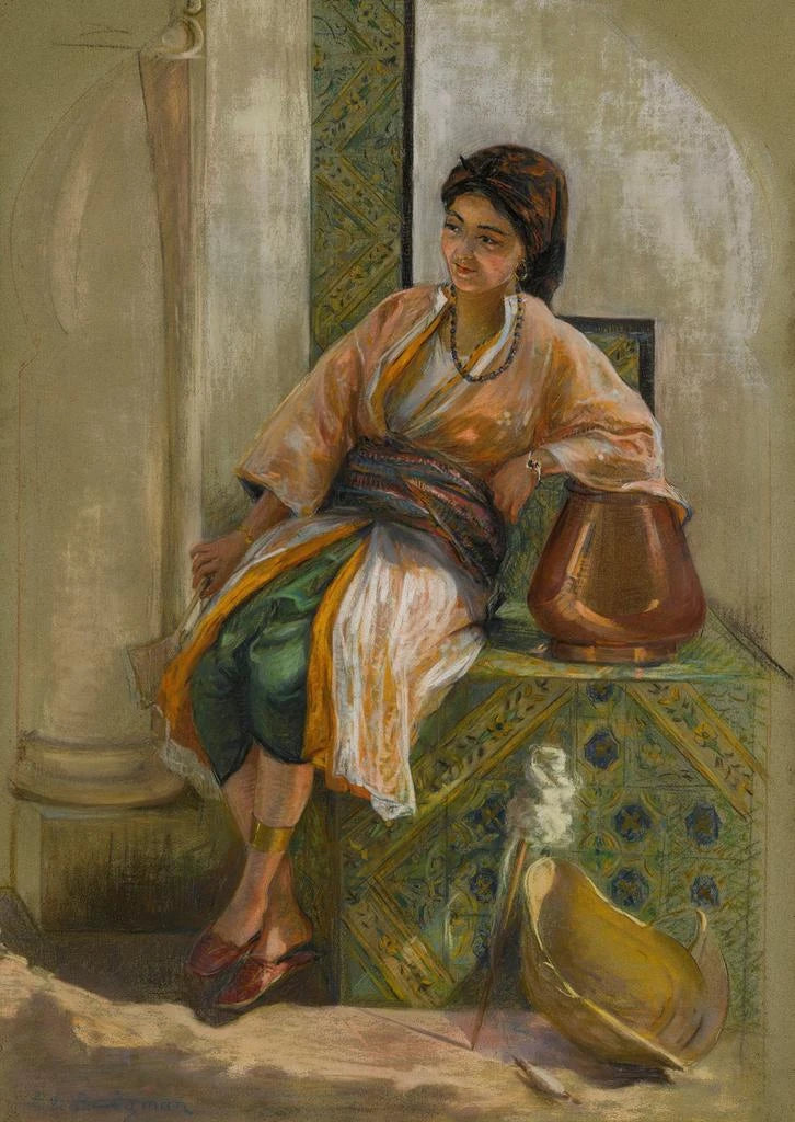 Frederick Arthur Bridgman, aktiv i slutningen af det 19. århundrede, er en amerikansk kunstner, hvis værker er dybt præget af orientalismen. Inspireret af sine rejser i Nordafrika og Mellemøsten, har han formået at oversætte skønheden i de orientalske kulturer gennem sine malerier. Hans stil, der kombinerer realisme med impressionistiske elementer, har gjort ham bemærket i sin tids kunstmiljø. "Jeune fille à l'éventail" er et perfekt eksempel på hans evne til at fange essensen af sine motiver, samtidig med at han indarbejder drømme- og mysteriumselementer, hvilket gør ham til en central figur i denne kunstneriske bevægelse.