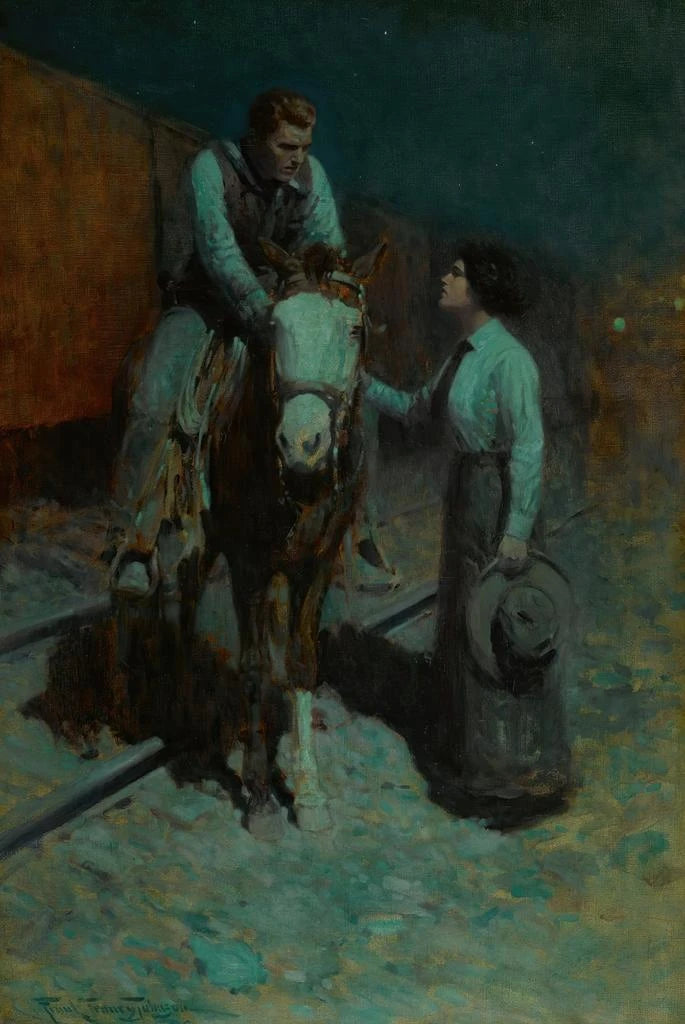 Kunsttryk af Maleri af Ung Pige og Cow-boy - Frank Tenney Johnson | Kunsttryk