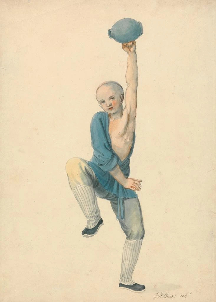 I dette fængslende værk præsenterer Thomas Stothard en ung kineser, hvis drømmende blik og delikate holdning antyder en skrøbelig skønhed. De bløde pastelfarver, blandet med lysreflekser, skaber en rolig og eftertænksom atmosfære. Stothards teknik, der kombinerer akvarel og gravure, giver liv til dette maleri, hvor hver detalje, fra stoffet i kjolen til den subtile smil fra den unge mand, er udført med stor finesse. Værket synes at invitere betragteren til at dykke ned i en verden af blidhed og flugt, hvor uskyld er i centrum.