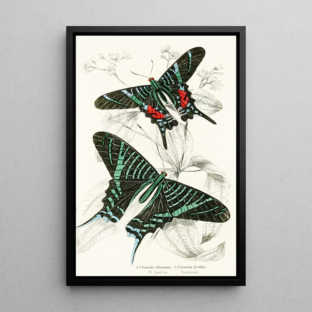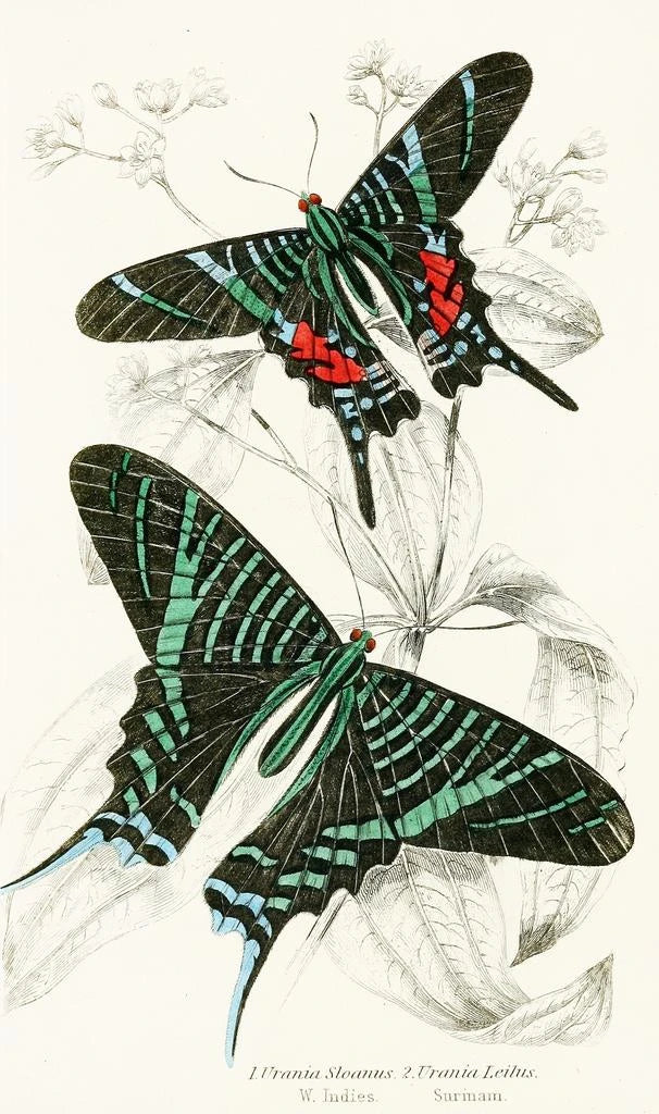 Urania Sloanus Urania Leilus af James Duncan er en livlig fejring af biodiversiteten. Dette maleri, rigt på farver, fremkalder en atmosfære af lethed og bevægelse. Nuancerne af grøn og blå blander sig harmonisk, hvilket skaber et landskab, hvor dyreliv og flora flettes sammen. Kunstnerens teknik, både præcis og udtryksfuld, giver mulighed for at føle detaljernes delikatesse, samtidig med at den fanger selve essensen af naturen. Hvert element i kompositionen synes levende, som om man kan høre hvisken fra bladene og fuglenes sang.