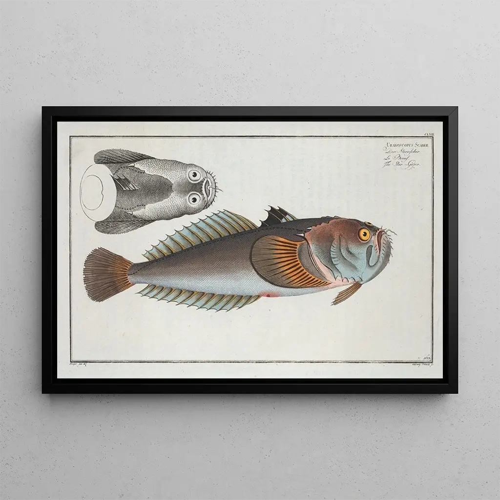 Kunsttrykket af "Uranoscopus scaber, den gazende fisk" er et ideelt valg til at berige din indretning. Uanset om det er i et kontor, et badeværelse eller en stue, tilføjer dette lærred et strejf af originalitet og nysgerrighed. Kvaliteten af kunsttrykket sikrer en bemærkelsesværdig trofasthed til detaljerne og farverne i det originale værk, hvilket gør det muligt fuldt ud at værdsætte dets æstetiske appel. Ved at integrere dette billede i dit rum inviterer du en del af den marine verden ind i dit hjem, samtidig med at du hylder Marcus Elieser Blochs kunstneriske arv.