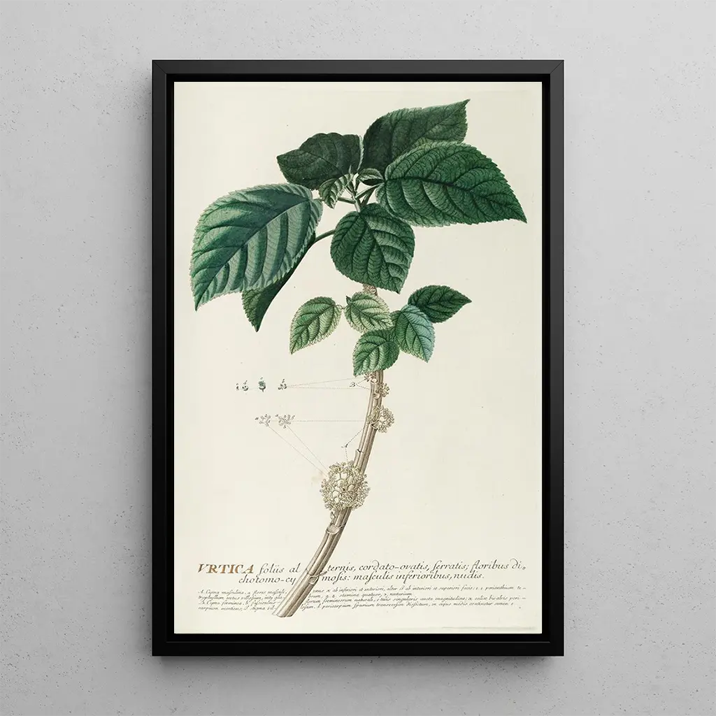 Urtica kunsttrykket af Georg Dionysius Ehret tilbyder et fascinerende syn på brændenærsplanten, som ofte er ukendt. Dette værk er kendetegnet ved detaljerede finheder og farver, der fremkalder naturens friskhed. De livlige grønne nuancer og de gule indslag lyser op på lærredet, mens Ehrets præcise teknik fremhæver de unikke teksturer på bladene. Atmosfæren i dette værk er både beroligende og tankevækkende, hvilket inviterer til en omhyggelig betragning af botanikkens vidundere. Hvert element er omhyggeligt gengivet, hvilket vidner om kunstnerens ekspertise i observationen af flora.