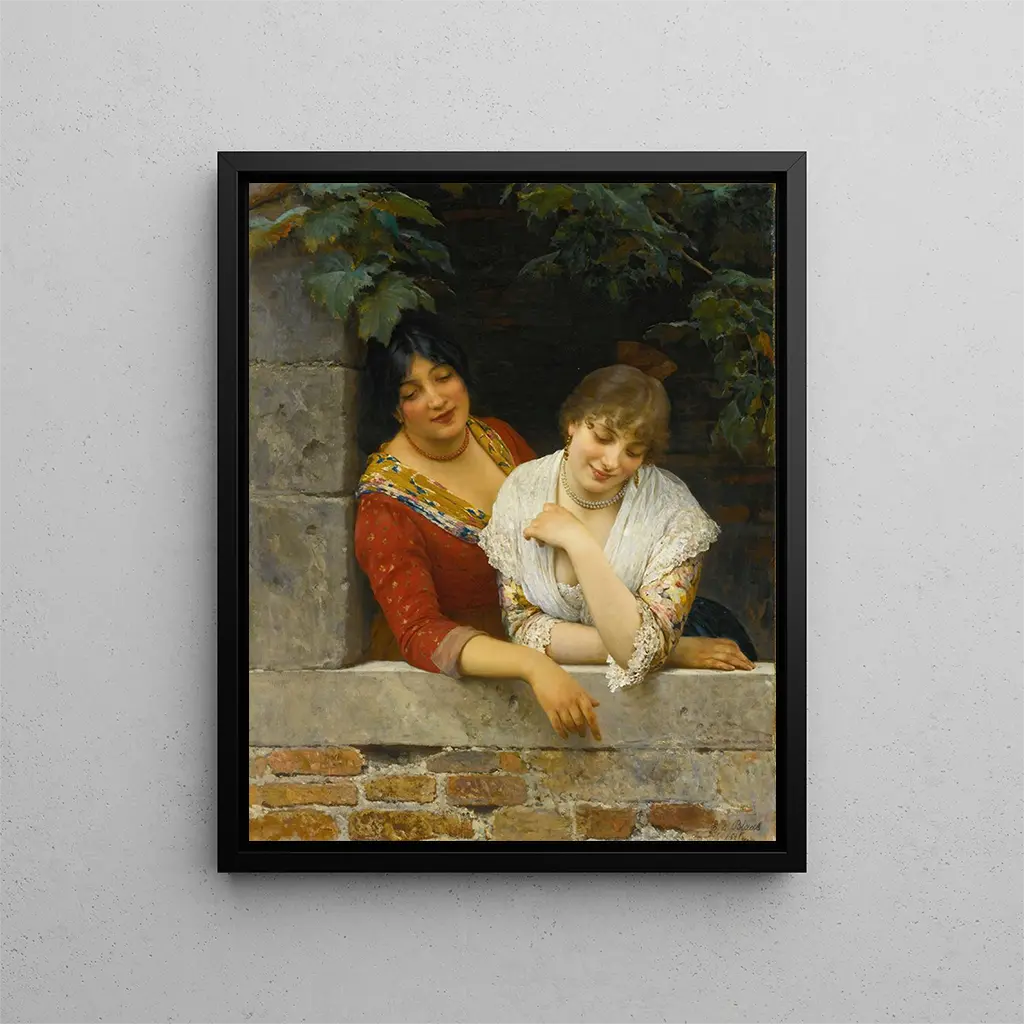 I den fascinerende kunstverden formår nogle værker at fange essensen af en æra, en kultur eller endda en universel følelse. "Venedigere ved balkonen" af Eugen von Blaas er et af disse værker, der transporterer betragteren til hjertet af den Serenissime, denne by med tusind refleksioner og tusind historier. Dette lærred, fyldt med lys og liv, inviterer os til at beundre skønheden i dagligdagens scener, samtidig med at det fejrer karakterernes elegance, der findes der. Gennem dette værk giver kunstneren os et vindue til et frosset øjeblik, hvor tiden synes at hænge i luften, og hvor man næsten kan høre hvisken fra Venedigs kanaler.