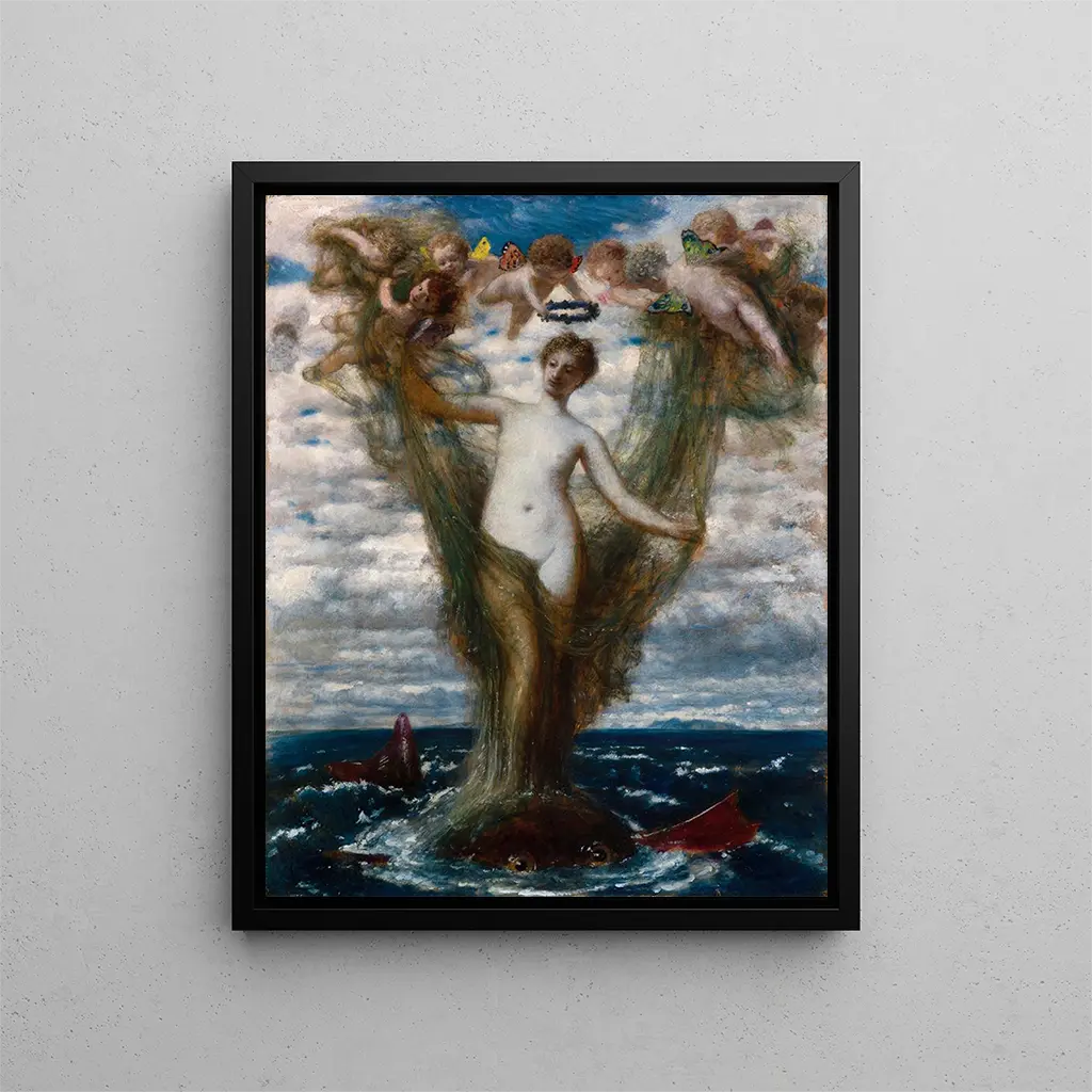 I det store panorama af kunsthistorien formår visse værker at overskride deres tid for at røre ved det universelle. "Vénus Anadyomène" af Arnold Böcklin er uden tvivl en af disse kreationer. Malet i slutningen af det 19. århundrede, fremkalder det den tidløse skønhed og sensualitet af kærlighedsgudinden, Vénus, der stiger op af bølgerne. Denne fremstilling, både mytologisk og dybt menneskelig, fanger betragteren med sin elegance og poesi. Scenen, badet i lys og delikate farver, inviterer til en contemplation, der går ud over det simple blik. Den indkapsler en harmoni mellem natur og ånd, og giver et vindue til kunstnerens sjæl og til de æstetiske aspirationer i sin tid.