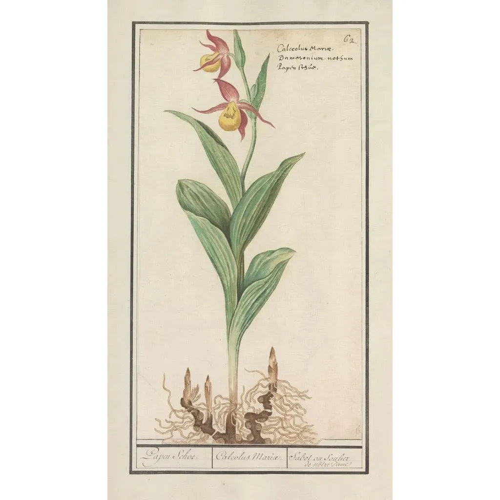 Kunsttrykket af Sabot de Vénus, Cypripedium calceolus, er en ægte fejring af blomsterens skønhed. Anselmus Botius de Boodt fremhæver gennem dette værk de fine detaljer i denne sjældne orkidé. De livlige farver, der spænder fra strålende gult til blid grønt, skaber en slående kontrast, der straks fanger øjet. Den præcise teknik, kunstneren anvender, kombineret med en harmonisk komposition, fremkalder en atmosfære af ro og forundring, og inviterer betragteren til at dykke ned i den fortryllende botaniske verden.