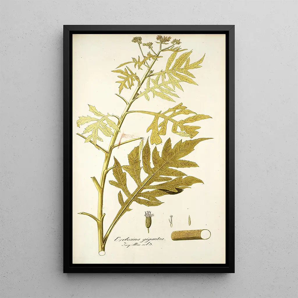 Den kunsttryk af Verbesina gigantea fordyber os i et blomstrende univers, hvor hvert detalje af planten er omhyggeligt gengivet. De livlige farver i dette maleri, der spænder fra lys gul til dyb grøn, fremkalder biodiversitetens rigdom. Kunstnerens teknik, der kombinerer botanisk præcision med kunstnerisk følsomhed, skaber en atmosfære, der er både videnskabelig og poetisk. Dette maleri inviterer til eftertanke og afslører skønheden i naturens former og teksturer, samtidig med at det fejrer farvernes harmoni.