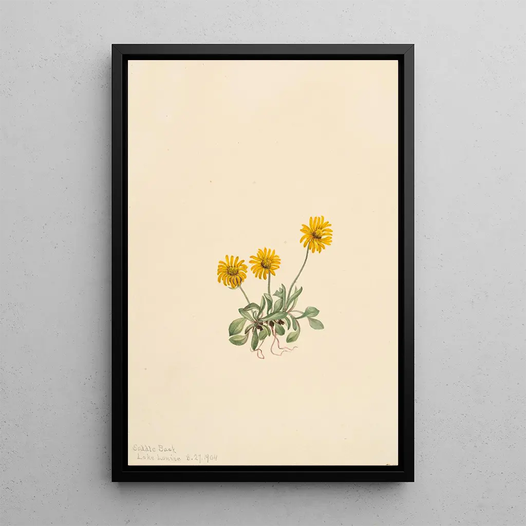 Kunsttrykket af Vergerette dorée, eller Erigeron aureus, tager os med ind i en livlig blomsterverden. De delikate nuancer af gult og grønt smelter harmonisk sammen og fremkalder sollysets filtrering gennem bladene. Den akvarelteknik, der er anvendt af Mary Vaux Walcott, giver dette værk en lethed og gennemsigtighed, der fanger selve essensen af planten. Atmosfæren, der udspringer af dette lærred, inviterer til eftertanke og forundring over den enkle, men slående skønhed i naturen.