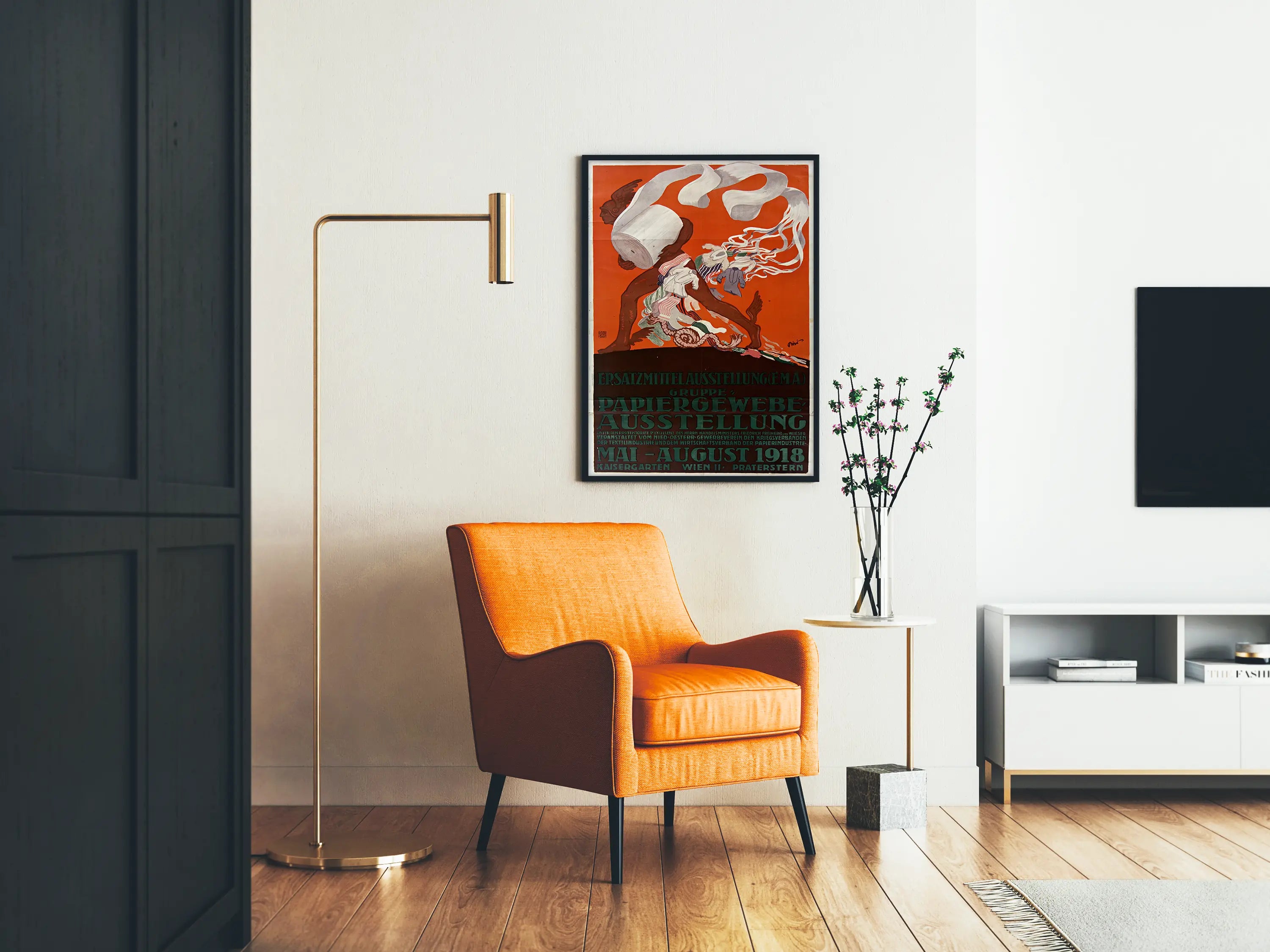 Opdag dette iøjnefaldende vintage plakat med titlen « Ersatzmittel Ausstellung Gruppe Papiergewebe Ausstellung », et bemærkelsesværdigt grafisk kunstværk fra maj til august 1918. Denne vægdekoration præsenterer en tidsbunden visuel stil, der kombinerer livlige farver med et suggestivt design. Den strålende orange baggrund fremhæver silhuetten af en dynamisk figur, stiliseret og sammensat af forskellige tekstilelementer og papir, hvilket symboliserer udstillingens tema om erstatningsmidler og papirtekstiler. Den bemærkelsesværdige kunstneriske sammensætning fanger opmærksomheden med sin flydende bevægelse og folder, der antyder lethed og tekstur af papir. Den mørke, store bogstavskrift nedenunder tydeligt annoncerer begivenheden og giver et typografisk karisma, der er karakteristisk for plakater fra begyndelsen af det 20. århundrede. Denne vægdekoration er ideel for historieentusiaster, grafisk kunst og vintage design, og tilføjer et autentisk og originalt præg til ethvert interiør. Uanset om du er retro plakat-elsker eller samler af sjældne grafiske dokumenter, udgør denne vintage plakat en unik vægdekoration, der beriger dit rum med en historisk og kunstnerisk atmosfære. Dens gamle stil og markante farver passer perfekt ind i en retro vægdekoration, kuriositetskammer eller kulturarvsrum dedikeret til kunst og historie. Denne historiske plakat understreger vigtigheden af industriudstillinger relateret til tekstiler og papir i begyndelsen af det 20. århundrede, især i 1918. Pynt dine vægge med denne papirgewebe udstillingsplakat, et symbol på en svunden æra og et spejl af en gammel æstetik, ideel til dine vintage og autentiske vægdekorationer.