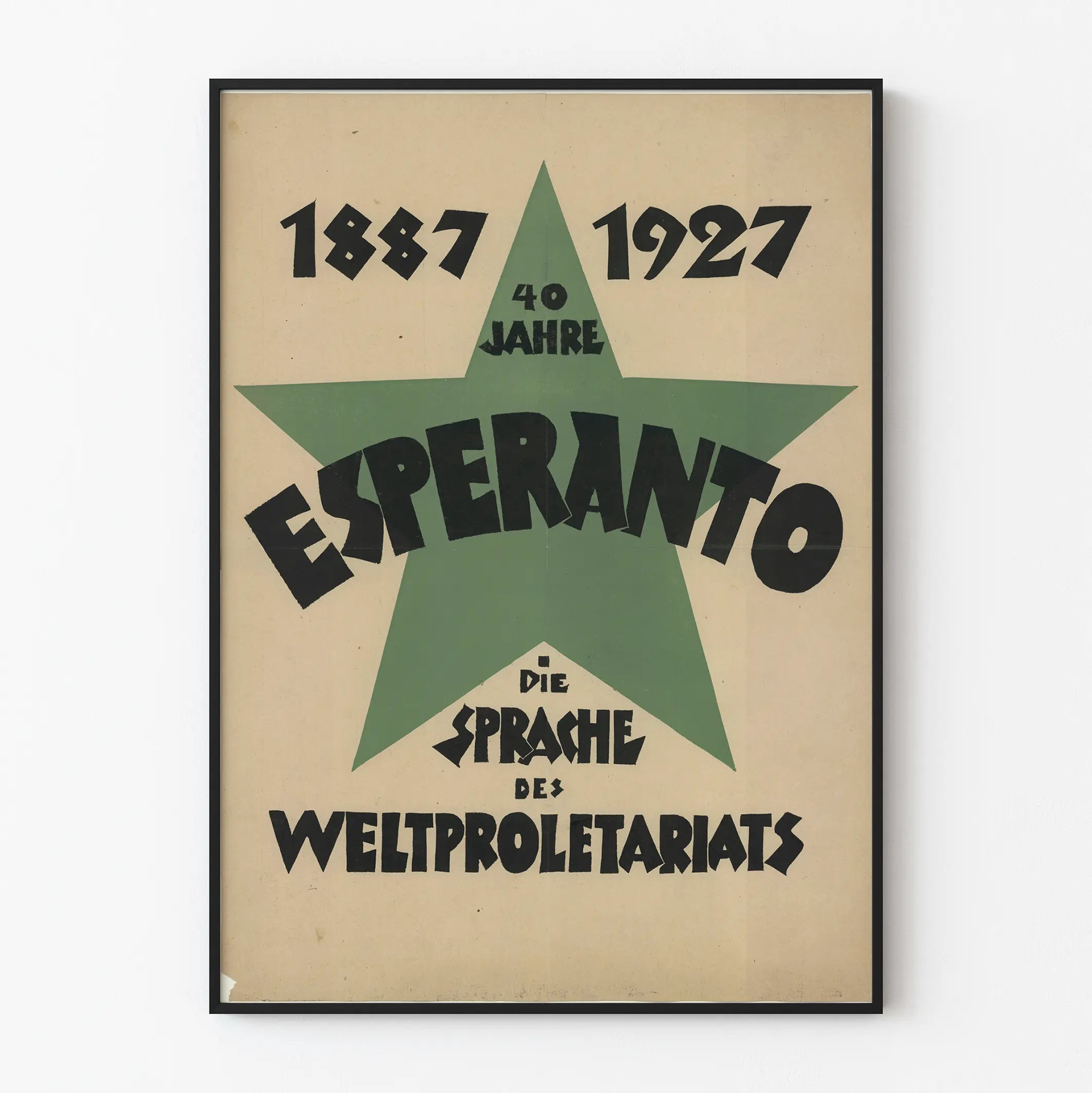 Denne vintageplakat fejrer 40-års jubilæet for esperanto, et verdenssprog skabt i 1887. På en beige baggrund dominerer en stor grøn stjerne størstedelen af kompositionen. I midten står ordet "ESPERANTO" skrevet med store, sorte bogstaver, formet i en markant, kantet grafisk stil, hvilket giver plakaten et både moderne og engageret udseende. Øverst på stjernen står teksten "40 JAHRE", der markerer fire årtiers jubilæum. På den øverste del af plakaten indrammer datoerne "1887" og "1927" stjernen, hvilket præcist angiver den periode, der fejres. Under hovedordet findes den tyske inskription "DIE SPRACHE DES WELTPROLETARIATS" (verdensproletariatets sprog), som understreger den sociale og politiske besked, der er knyttet til esperanto, ofte opfattet som et værktøj til international enhed. Denne minimalistiske plakat bruger en begrænset farvepalette med grøn, sort og beige, hvilket fremhæver dens retro- og autentiske karakter. Ideel som vægdekoration for sproginteresserede, sproghistorikere eller historiske plakater, er denne plakat et kraftfuldt dekorativt element, der vil tiltrække opmærksomhed i et bibliotek, et kontor eller et studie. Dens enkle, men slagkraftige grafiske stil gør, at denne vintageplakat forbliver tidløs, samtidig med at den minder om esperantos kulturelle og politiske betydning i begyndelsen af det 20. århundrede. Den henvender sig til dem, der værdsætter vægdekorationer med et stærkt budskab, der kombinerer historie, sprog og socialt engagement.