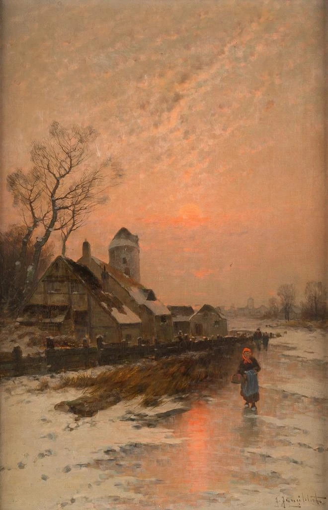 Johann Jungblut, aktiv i det 19. århundrede, er kendt for sine landskaber, der fanger naturens skønhed med delikate farvepaletter. Påvirket af romantikken, tilhører han en kunstnerisk tradition, der værdsætter følelser og personlig udtryk. Hans værker, ofte inspireret af dagligdags scener og naturlandskaber, vidner om en skarp følsomhed over for lys- og farvevariationer. Jungblut har formået at skille sig ud ved sin evne til at gengive atmosfæren i et flygtigt øjeblik, som det ses i "Solskins vinter på frossen sø", der fremkalder magien i et vintersceneri.