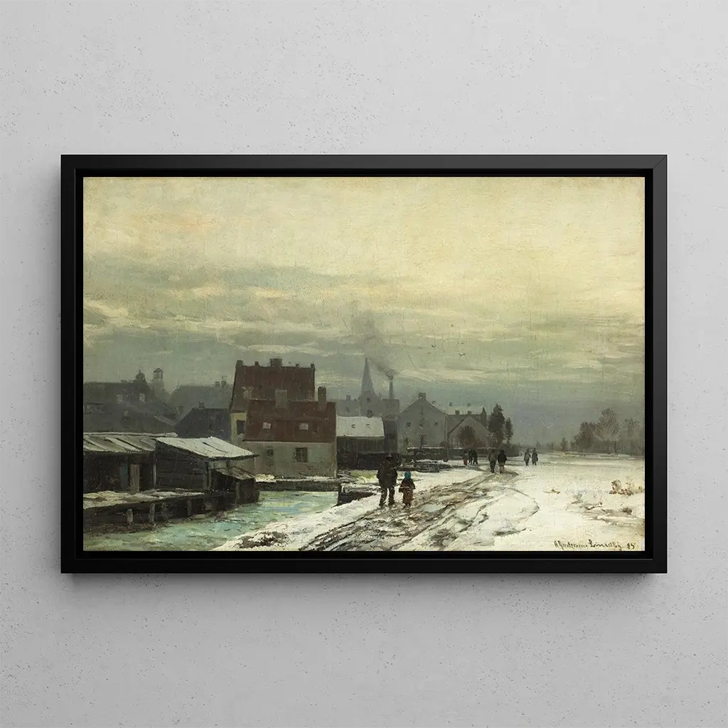 I "Paysage d'hiver" tager Anders Andersen-Lundby os med til hjertet af en vinterscene fyldt med magi. Lærredet, badet i blødt lys, fremhæver et snedækket landskab, hvor snefnuggene glitrer under en klar himmel. Træerne, dækket af et tyndt lag sne, står yndefuldt, mens en delvist frossen bæk snor sig gennem kompositionen. Lundbys teknik, der kombinerer realisme og impressionisme, skaber en fredelig og kontemplativ atmosfære, der inviterer betragteren til at drømme sig væk i denne fortryllende vinternatur.