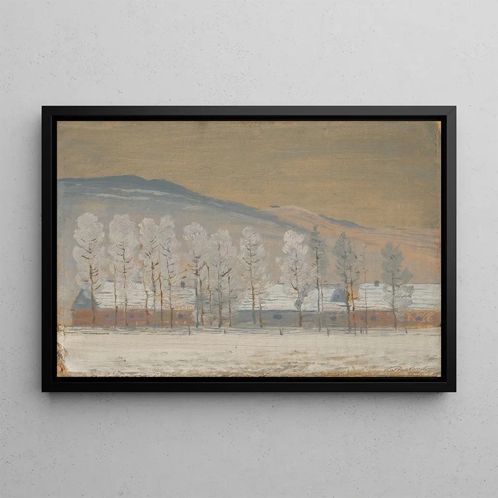 Paysage d'hiver près de Diar : une sérénité hivernale à contempler Le tableau "Paysage d'hiver près de Diar" de Ferdinand Katona évoque une atmosphère paisible et silencieuse, où la neige recouvre délicatement le paysage. Les teintes froides de bleu et de blanc se mêlent harmonieusement, créant un contraste subtil avec les touches de brun des arbres dénudés. La technique de Katona, caractérisée par des coups de pinceau précis et une attention minutieuse aux détails, permet de ressentir la fraîcheur de l'air hivernal. Ce tableau invite à une contemplation méditative, où chaque élément semble figé dans le temps, offrant un moment de répit loin de l'agitation du monde moderne. Ferdinand Katona : un maître du paysage romantique Ferdinand Katona, actif au XIXe siècle, est reconnu pour ses paysages évocateurs qui capturent la beauté de la nature. Influencé par le mouvement romantique, il s'inspire des grands maîtres de l'époque, tout en développant un style personnel qui met l'accent sur l'émotion et l'atmosphère. Ses œuvres, souvent empreintes de mélancolie, reflètent une profonde connexion avec la nature et un désir de transmettre des sensations intenses. Katona a su s'imposer comme un artiste majeur de son temps, et "Paysage d'hiver près de Diar" demeure l'une de ses créations les plus appréciées, témoignant de son talent indéniable. Une acquisition décorative aux multiples atouts La kunsttryk du "Paysage d'hiver près de Diar" est une pièce décorative idéale pour apporter une touche de sérénité à votre intérieur. Que ce soit dans un salon, un bureau ou une chambre, ce tableau invite à la rêverie et à la contemplation. Sa qualité de kunsttryk garantit une fidélité remarquable aux détails originaux, permettant de profiter pleinement de l'attrait esthétique de l'œuvre. Avec ses nuances délicates et son ambiance apaisante, cette toile saura enrichir votre décoration tout en créant une atmosphère chaleureuse et accueillante.