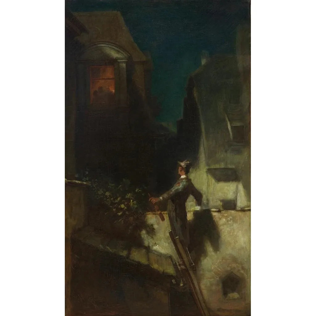 Dans cette œuvre captivante, Carl Spitzweg nous plonge dans une atmosphère onirique où un violoniste joue sous la lueur douce de la lune. Les couleurs pastel se mêlent harmonieusement, créant un contraste entre l'obscurité de la nuit og la lumière argentée qui éclaire le musicien. La technique de Spitzweg, caractérisée par des détails minutieux et une touche romantique, évoque une sensation de sérénité og de mélancolie. Chaque élément de la composition, des arbres en arrière-plan aux notes flottantes, contribue à une ambiance poétique, invitant le spectateur à s'immerger dans cette scène musicale.