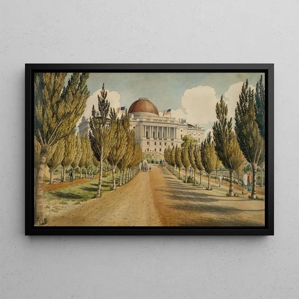 Kunsttrykket af "Vue du Capitole" af Charles W. Burton tilbyder en fordybelse i den ikoniske arkitektur i Washington D.C. Dette maleri, rigt på detaljer, fremhæver Capitol, symbolet på den amerikanske demokrati. De livlige farver og skyggelege skaber en atmosfære, der er både højtidelig og livlig. Burtons teknik, der blander realisme og romantik, giver mulighed for at føle bygningens storhed, mens man bliver transporteret af det omkringliggende landskabs skønhed. Hvert penselstrøg synes at fortælle en historie, der inviterer betragteren til at betragte ikke kun bygningen, men også den historiske kontekst, der omgiver den.