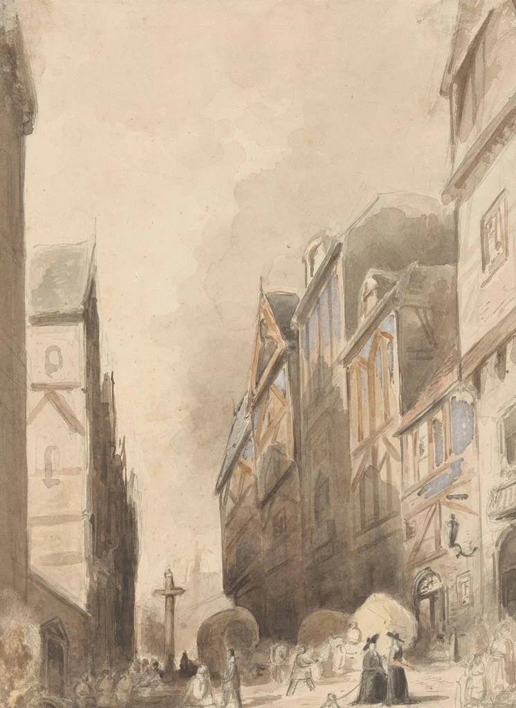 I "Vue i en fremmed by" tager Jan Diederikus Kruseman os med til hjertet af en pulserende byscene. Kompositionen, rig på detaljer, fanger essensen af en livlig by, hvor figurer blander sig med majestætisk arkitektur. Farverne, både varme og kolde, skaber en dynamisk atmosfære, der antyder bevægelse og liv. Kunstnerens teknik, der kombinerer realisme og impressionistiske strejf, tilføjer dybde til værket og inviterer betragteren til at fordybe sig i dette frosne øjeblik. Hvert element i lærredet synes at fortælle en historie, en invitation til at udforske gaderne i denne fremmede by.