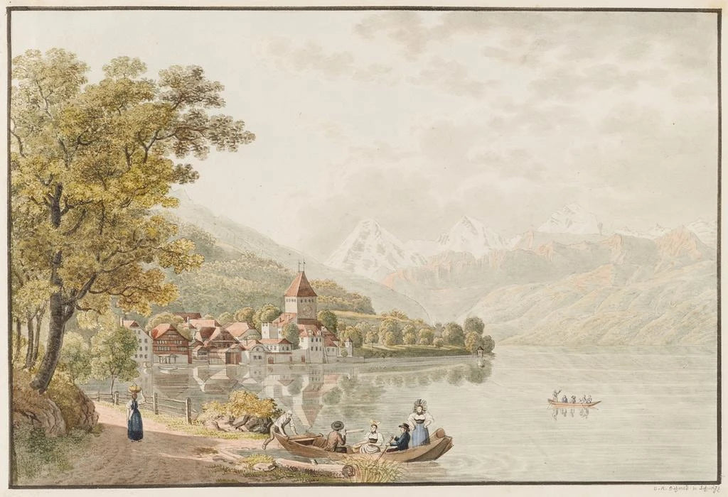 David Alois Schmid, schweizisk kunstner fra det 19. århundrede, er kendt for sine landskaber, der hylder den alpine natur. Påvirket af romantikken søger han at udtrykke følelser og storhed i de schweiziske landskaber. Schmid har formået at fange lyset og atmosfæren i sine motiver, hvilket har givet ham en fremtrædende plads i schweizisk kunsthistorie. Hans værker, ofte inspireret af hans rejser gennem Alperne, vidner om en tid, hvor naturen blev set som en kilde til inspiration og eftertanke. "Vue af Oberhofen ved Thun-søen" er et perfekt eksempel på hans evne til at oversætte den naturlige skønhed til kunst.
