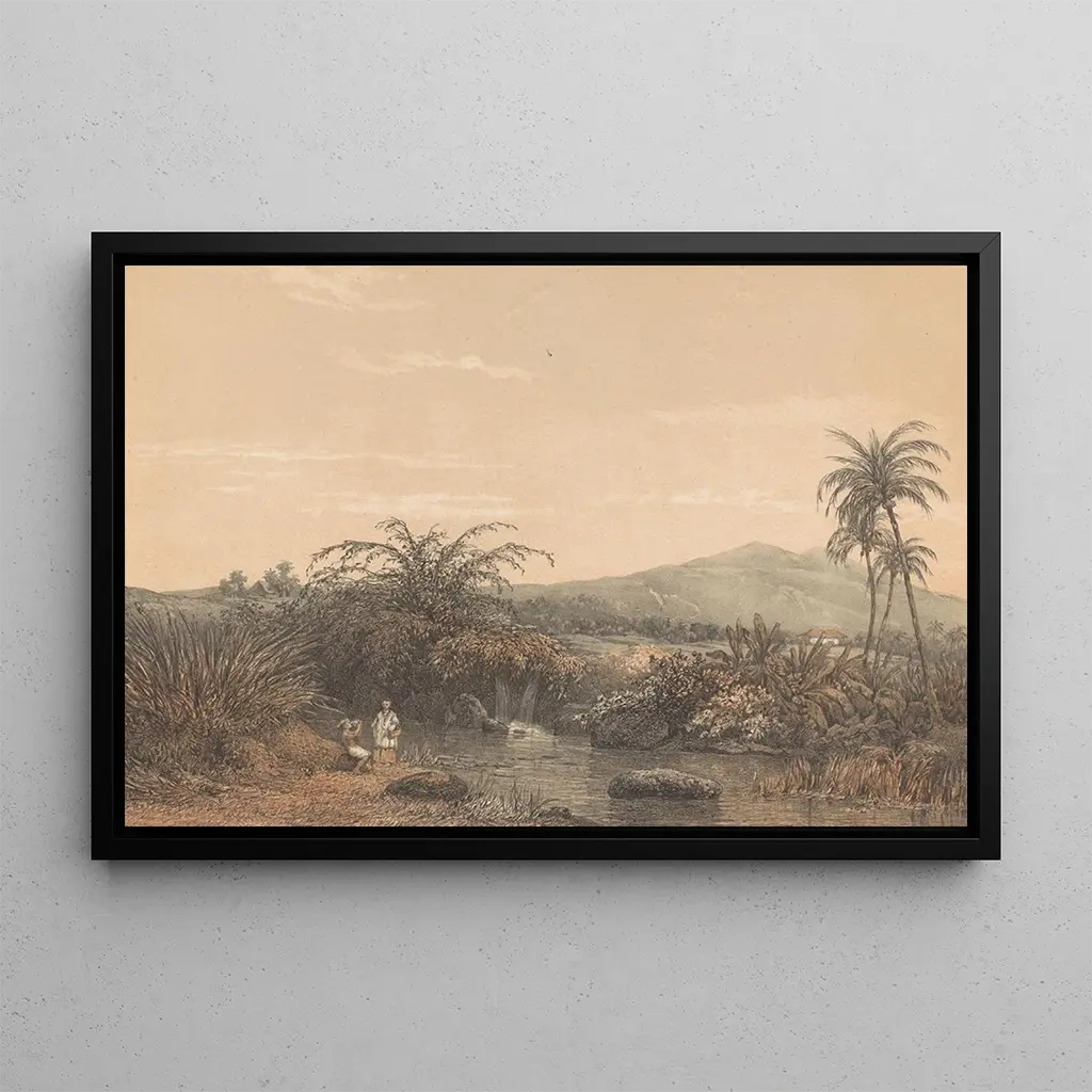 "Vue over Tjileboet" af Johan Conrad Greive bringer seeren til hjertet af et frodigt indonesisk landskab. Dette kunsttryk, rigt på detaljer, skildrer en scene hvor naturen blomstrer i al sin pragt. De livlige grønne nuancer i bladene blander sig med de bløde skyer, hvilket skaber en atmosfære af fred og harmoni. Greives teknik, der kombinerer realisme og impressionistiske strejf, gør det muligt at føle varmen og fugtigheden i dette idylliske sted. Dette kunsttryk inviterer til en sanseflugt, hvor hvert blik afslører en ny facet af dette fortryllende landskab.