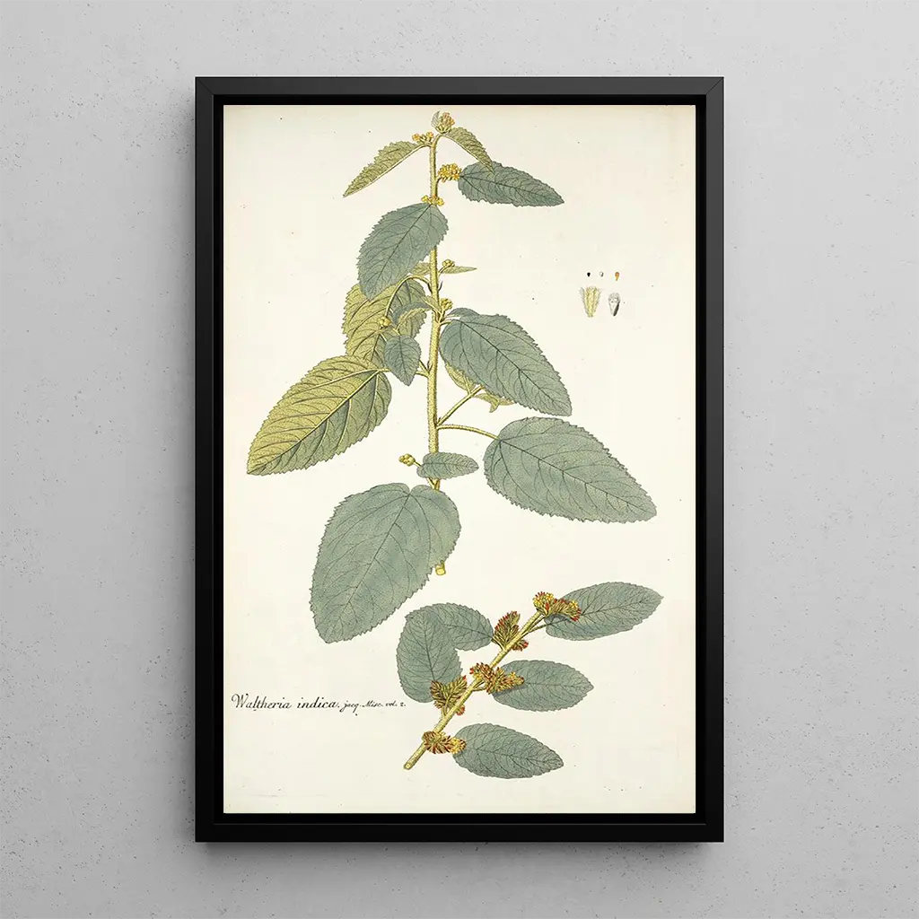 Kunsttrykket af Waltheria indica tager os med til en frodig verden, hvor blomsterens ynde og farvernes rigdom mødes. Nikolaus Joseph Freiherr von Jacquin's værk fanger med finesse de subtile nuancer af denne tropiske plante, hvilket fremkalder en atmosfære af friskhed og eksotisme. De omhyggelige detaljer, fra kronblade til blade, er gengivet med en præcision, der vidner om en dyb respekt for naturen. Farvepaletten, der skifter mellem dybe grønne og strålende gule, skaber en visuel harmoni, der inviterer til eftertanke og flugt.