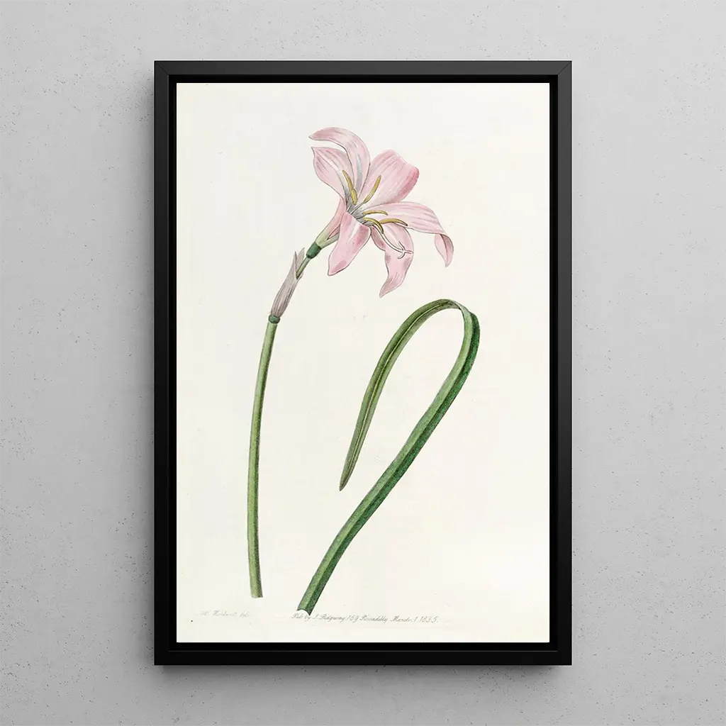 Kunsttrykket Zéphyranthe de Spofforth, også skabt af Sydenham Edwards, er en delikat gengivelse af denne sjældne og elegante blomst. Nuancerne af hvid og rosa flettes yndefuldt sammen, hvilket fremkalder lethed og plantens skrøbelighed. Akvarelteknikken gør det muligt at fange gennemsigtigheden af blomsterbladene, mens den subtile baggrundsnuance skaber en beroligende naturlig atmosfære. Dette værk inviterer til eftertanke og giver et øjebliks ro til dem, der betragter det, som om man bliver ført ind i en hemmelig have, hvor naturens skønhed hersker.